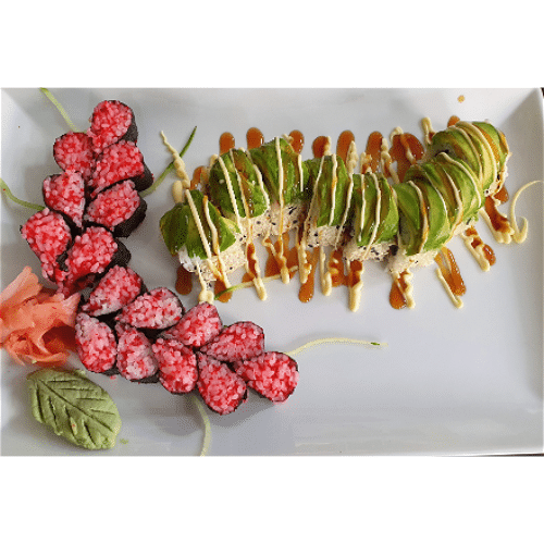 73 stuks- 8x Salmon roll- 8x California roll- 8x Spicy tuna roll- 8x Ebi tempura roll- 8x Phoenix- 6x Sake maki- 6x Tekka maki- 6x Kappa maki- 6x Avocado maki- 5x Gyoza- 4x Gefrituurde garnalen